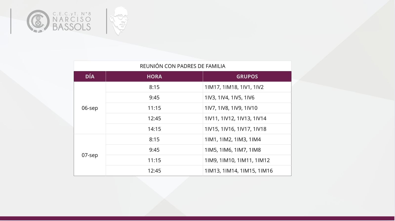 Éste es el programa ordenado por grupos, deberán ubicar su grupo, día y horario, y deberán acudir a la escuela de forma presencial padre o madre o tutor y el estudiante (2 asistentes únicamente).